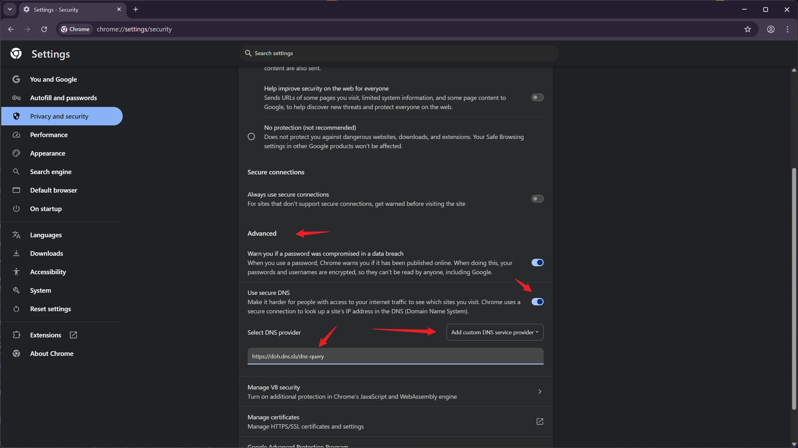 Enter chrome://settings/security in the address bar.